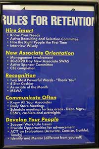ウォルマートでは、各アソシエイトが、互いに尊敬と誠意を持って対応し、自己中心的考えを捨て、他人の成功のための支援を積極的に行うことを奨励しており、この実現で、会社を成功に導けた人が将来のリーダーとなると考えています。この考え方から、形式的になりがちな組織に壁を作らず、お互いが理解し合うために話し合うことで、顧客のニーズの変化を上手くキャッチし、この適切な対応を容易にしています。自立/自律志向と同時に、互いに協力し合う企業風土(メンタリング風土)を育てる配慮をする点が、成功への大きな要因となっています。優秀な人材を維持し、育成し、会社の継続的成長に大きく貢献すると同時に、優秀な人材を採用する際にも役立っています。この現場での協力関係の構築が、全体の競争力の強化に大きく貢献しています。 |