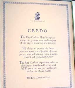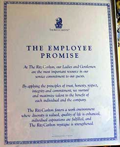 サービス品質の高さで、過去2回、マルコム・ボルドリッジ賞を受賞したリッツカールトンホテルでは、「We are Ladies and Gentlemen serving Ladies andGentlemen」との方針のもと、従来のサーバントが奉仕する感覚から、自らも紳士、淑女のプライドを持ちながら、相手の名前をきちんと呼びながら、対等な立場で、支援する気持ちをもちつつお世話する企業風土を醸成する教育を実施しています。この基本は、コーチング文化が基盤にあります。従業員にプライドとプライドに反しない態度、行動を期待するものであり、この教育方法、企業風土により、従業員の定着率も上がり、業績への効果を生んでいます。 教育方針: