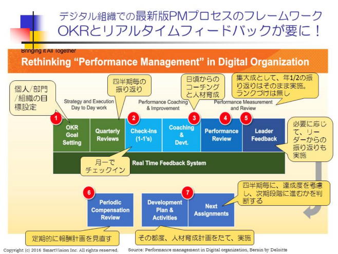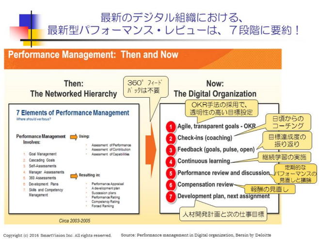 この改善により、急速な市場の変化に対応し、目標の見直しを含めて、人事考課を行うコーチング&人財開発モデルへの転換になります。 また、従来のISOのマネジメント手法におけるPDCAプロセス重視の考え方は、そのままですが、良い結果を引き出せるより効果的なマネジメント手法をとっているかを示すガイドラインになります。 欧米企業での急速な普及に伴い、70-80%の方から、評判がよく、スマホのフィードバックソフトを活用した導入法は、特にミレニアル世代からは、高い評価を得ています。 日本では、この評価・効果測定手法に関して、色々な議論が出てくることが予想されますが、日本企業の得意な品質管理と違い、ホワイトカラーの効果性をどう測定して、評価するかが課題になります。 欧米諸国では、多くの導入事例が、SHRM/ATD等の国際大会でも発表され、日本の外資系企業を中心に、普及することになります。 詳細は、パフォーマンスコーチング&メンタリング基礎コース、及びパフォーマンス・マネジメント実践コースで紹介しており、具体的事例のロールプレイ演習も体験できます。 特に、品質管理、環境測定分野では、効果測定やその改善手法で、世界をリードする日本企業が多いこともあり、人材マネジメントHRMの分野でも、世界をリードするグローバル企業の登場が期待されます。 |