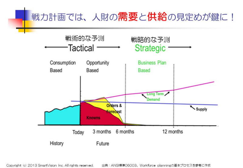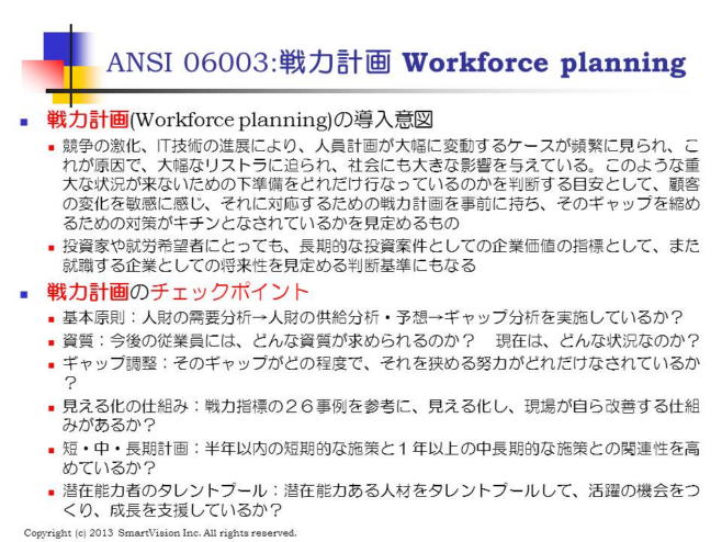このANSI06003の原案では、戦力計画の概念が公表され、人財の需要(1年以上の戦略的計画を実行するため必要な人財)と供給(現在保有する人財)を明確にします。
