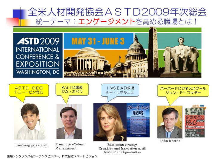 全米人材開発協ASTD2009年次総会が、2009年5月31日-6月3日、ワシントンDCで開催された。今年は、昨年の10,000名から約8000名に減少はしたものの、参加国は、増えて79国となった。