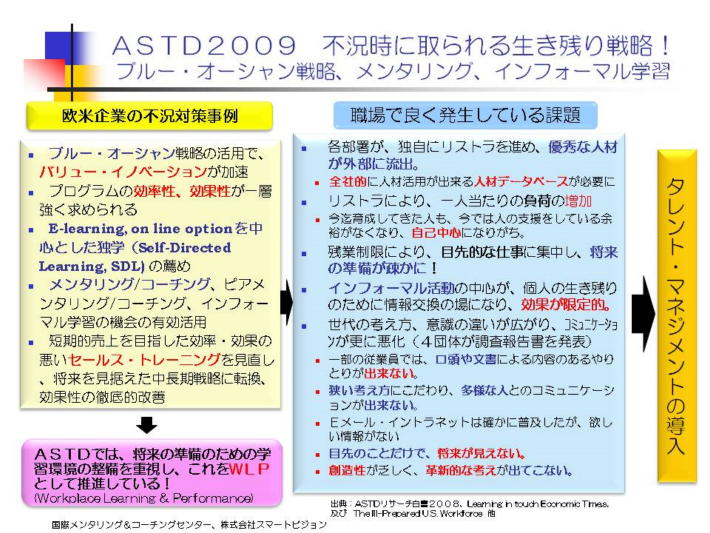 今回のASTD2009年次総会で発表された各種の新しい人材マネジメント手法は、必ずしも、不況対策だけとして、準備されたものではない。しかし、不況時だからこそ注目され、今すぐ行動を起こすことで、大きな抵抗もなく、スムースに導入することが可能になるのである。