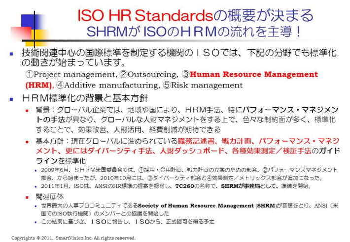 今年、注目すべき点は、SHRMが、ISOでのHRの標準化に乗り出したと言うニュースだ。