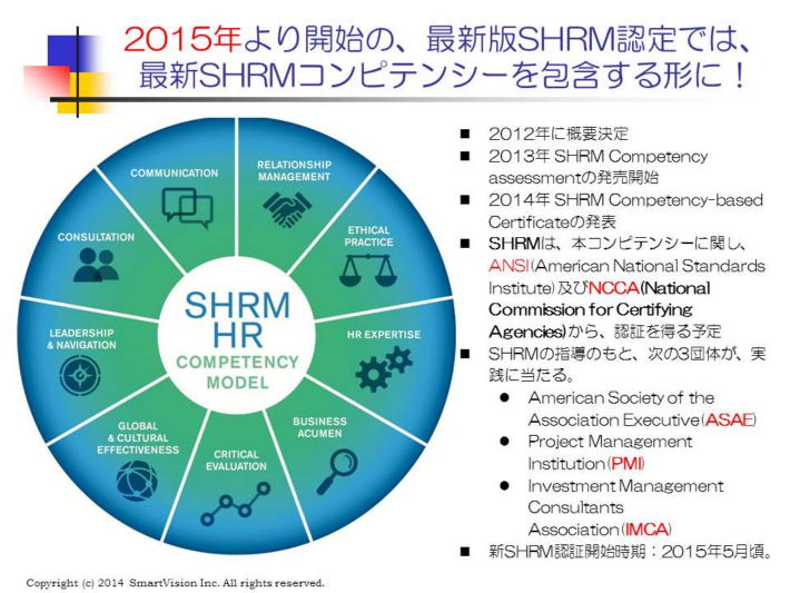 すでに発表された新SHRMコンピテンシーでは、効果的にパフォーマンスを達成するための知識(knowledge)と行動(Behavior)の両面を重視する行動主義を強化しています。従い、知っているだけで、行動が伴ってない人は、不適格ということになる。 さらには、「ビジネスにどれだけ貢献したか?」も重視することになる。 また、今後は、米国以外のグローバルHRプロの養成に力をいれるため、海外のHRプロには、米国法を除いたSHRM認定として、既に、HRBP(Human Resource BusinessProfessional)や、HRMP(Human Resouce Management Professional)が既に新設された。今回、HRMPの学習システムを購入して、その概要を検討してみたが、タレント・マネジメント、戦力計画等の戦略的人材マネジメント、ビジネスへの貢献を意識した内容が目立っている。 新SHRMコンピテンシーは、2012年にその概要を決定し、2013年には、アセスメントツールを発表、2014年には、従来のSHRM認定を新SHRコンピテンシーベースに改訂することを発表しました。来年2015年5月から、正式に開始される。