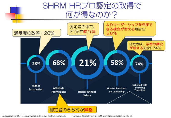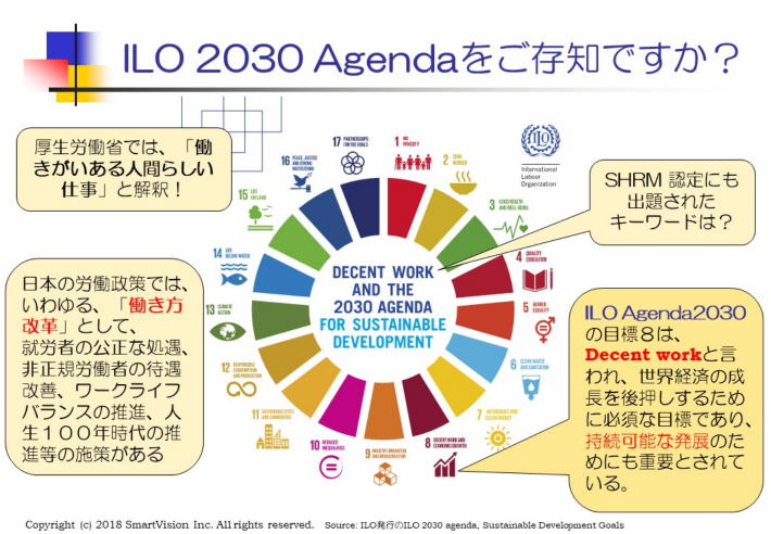 現在には、なんと110,750名の認定者が誕生した。これは、予想以上に、順調に進んでいることを示している。 CP/SCP HRプロ認定では、人材マネジメント関連の基本的知識だけでなく、HRプロとしてのコンピテンシーを理解し、積極的、戦略的に問題解決、意識改革に取り組むことが求められる。ここが他のスキル認定とは全く異なる点だ。 多くのコーチ認定では、経営学の勉強を特別する必要はないと説明している所が多いが、SHRM CP/SCP HRプロ認定では、人材マネジメントの最新知識を必要としているだけでなく、HRプロとしての基本的心構えとしてのSHRMコンピテンシーを理解し、戦略的に挑戦する意欲のある人材をHRプロとして認定し、企業内での課題の多い意識改革の先頭に立ってもらおうという期待が込められている。 このような点もあり、今年のSHRM 2018コンファレンスで紹介されたHRプロのほとんどがSHRM認定者になっており、SHRM幹部になる人では、特に重要な条件になっている。 欧米一流企業でも、HRプロの重要性がまし、M&Aプロジェクト、企業風土改革等の大プロジェクトでは、SHRM HRプロ認定者が、優先的に登用される状況になってきた。当然、給与、人事評価、昇格、キャリア認定でも、優位になるケースが、増えてきたと言える。 日本の外資系企業でも同様の状況がうまれつつある。この認定試験は、すべて英語で行われることもあり、欧米およびアジアの大学や大学院の卒業生が有利になるのは当然のこと。日本の大学卒業生には狭き門になる可能性が高い。 外資系企業で、HRプロとして活躍したいと考えている方は、この点も留意して、SHRM CP/SCP HRプロ認定の準備を早めに進めることをお勧めしたい。 最近のSHRM CP/SCP認定試験では、SHRM Learning SystemのAssessmentと全く同じ問題は出題されないが、知識問題では、多少切り口の違う、類似問題は、結構多数出題される。 また、最新のトピックスは、よく出題されるので、特に注目しておく必要がある。 たとえば、日本では「働き方改革」として、色々な施策が決まっているが、この多くが、ILO等で、議論され、ILO2030 Agendaにも掲載されている。日本政府の解釈とILO等のアジェンダに掲載されている内容は、ニュアンスも、意味も結構違うものもあり、世界的機関で議論されている国際的な人材マネジメントの課題を理解して、日本版との違いを理解しているかを問われることになる。 最近、ILO 2030 agendaのDecent workの内容が出題されており、日本の仕組みと世界での議論の両方を理解していないと回答できないものが多くなった。 特に、日本と欧米では、とらえ方の違いがよくあり、この点もよく理解していることがもとめられる。 「日本の常識は、世界では、非常識である」こともよくあることを理解しているかどうかが、カギになる。 欧米諸国で進められている人材マネジメントの動きを学びたい方には、日本人材マネジメント協会JSHRMの自主運営研究会として、SHRMコンピテンシー研究会がありますので、この研究会に参加し、最新の知識を学んでください。 SHRMコンピテンシーに興味をお持ちの方、SHRM CP/SCP認定に挑戦してみたい方は、SHRMコンピテンシー研究会に参加して、勉強仲間をつくり、互いに学ぶ関係を構築することで、その第一歩が開らかれます。 SHRMコンピテンシー研究会に参加希望の方は、こちら |