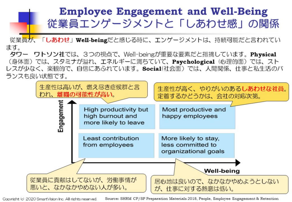 それでは、従業員エンゲージメントとしあわせ感(Well-being)は、どんな関係があるのでしょうか? SHRM Learning Systemでは、下記のような説明をしています。しあわせ感には、少なくとも身体的側面、心理的側面、社会的側面があります。