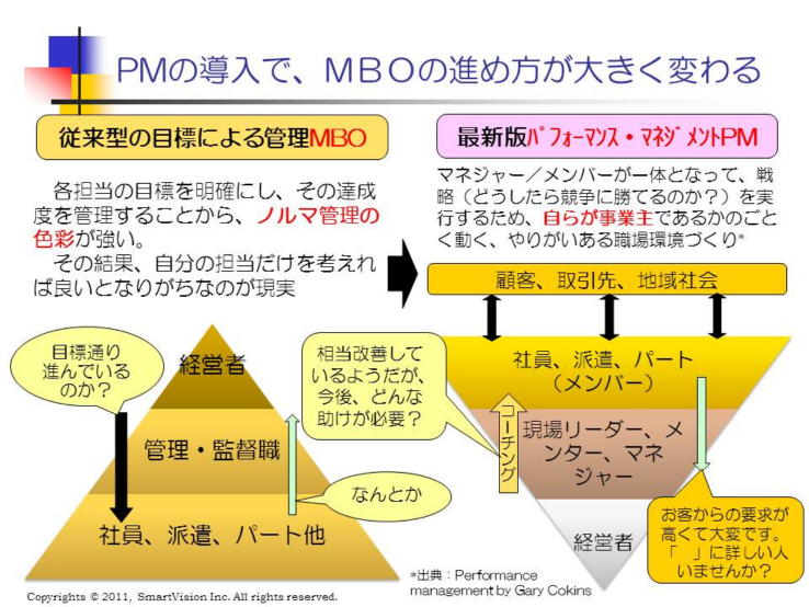 更には、IBMやその他多くの有力IT企業でさえ、この流れにのり、新しい評価体系に2016年度から切り替えたと発表しています。 この勢いは、更に加速され、数年の内に、欧米先進企業の80%以上が、新しいパフォーマンス・マネジメントに転換しました。 これからは、過去の成功事例を教えるのではなく、メンバーの状況を把握しながら、最大の効果を引き出しているかを問われる時代になります。この基本になる最新版のパフォーマンス・マネジメントを学ぶコースを開設しました。 最新のパフォーマンス・マネジメントの導入により、現場リーダーやマネジャーは、当初の目標による管理(MBO)だけでなく、最低限の効果を引き出すことが求められ、この実現に必要なパフォーマンス・マネジメントがなされているかが問われます。