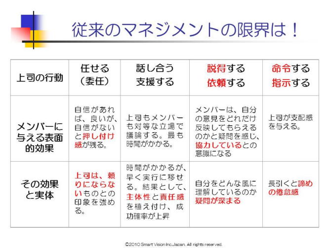 従来型マネジメントでは、チーム・メンバーに技能や意欲があろうとなかろうと、最初は、「指示・命令」で、仕事をやらせることが、手っ取り早く簡単で、効率的であると考えています。これになれた社員は、一見おとなしく命令に従っているように見えますが、実際は、その背後では、違った行動をとりやすいとも言えます。上長には、反感を持ち、故意に妨害をしたり、業績を悪化させることも良くあります。上長は、社員を支配している積もりが、全く逆になりかねません。