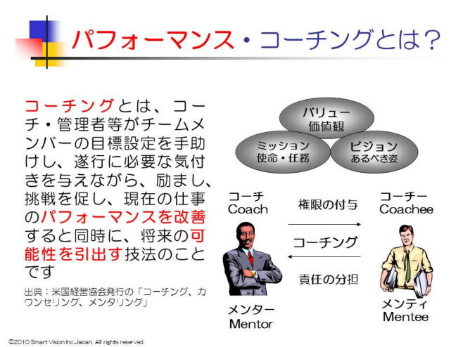 米国経営協会発行の「コーチング、カウセリング、メンタリング」では、コーチングとは、「コーチや管理者等がチーム・メンバーの課題・目標設定を手助けし、前向きの姿勢で、遂行に必要な気づきを与え、励まし、挑戦を促し、現在の仕事のパフォーマンスを改善すると同時に、将来の可能性を引き出す技法のことです。」これは、パフォーマンス・コーチングの基本的考え方を示しており、仕事の結果と将来の可能性を引き出し、仕事のパフォーマンス改善があったかどうかが、パフォーマンス・コーチングであるかの判断の鍵とされます。