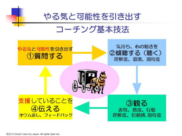 やる気を引き出すコーチング基本スキルには、@質問する、A傾聴する(聴く)、B観る、C伝えるの4つがあります。これを聞くと、「こんなこといつもしているよ!」と思えるでしょう。しかし、コーチング基本スキルには非常に奥深いものがあります。