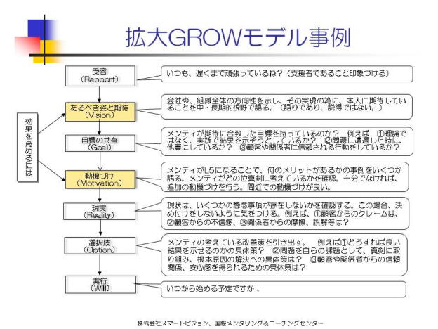 そこで、主体的な改善を促すには、どのようにするべきか、会社が考えている将来のあるべき姿を示し、メンバーに求められていること(期待)を語ることで、方向性を明確化します。その上で、メンバーに改めて、目標として設定を促し(指示命令としてではなく、例えば期待の実現として)、自らその改善計画をGROWモデルで、引き出します。このような引き出し手法を拡大GROWモデルと呼んでいます。この拡大GROWモデルでは、目標の共有に至るため、その前にどのような将来のイメージ像を持っていて、その中でメンバーがどのような点で期待されているかを上手く伝えられるかであり、その期待にどれだけこたえられれば、上長や回りからは、どのように感謝され、認められるかを、効果的に動機づけられるかにかかっています。