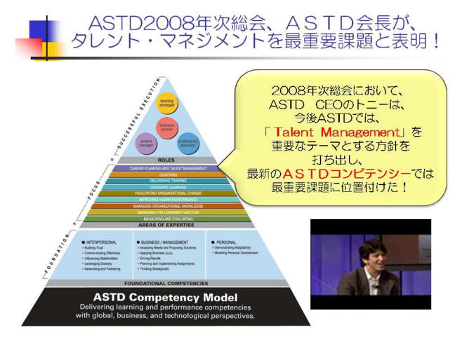 ASTDでは、2004年に独自のコンピテンシー・モデルを発表し、WLP(Workplace Learning & Performance)時代の世界の標準として相応しいコンピテンシーとして、会員企業に導入を促しました。2008年には、改訂を行い、専門領域のなかでも、キャリア計画とタレント・マネジメントを最重要のテーマに位置づけました。 ![]() |