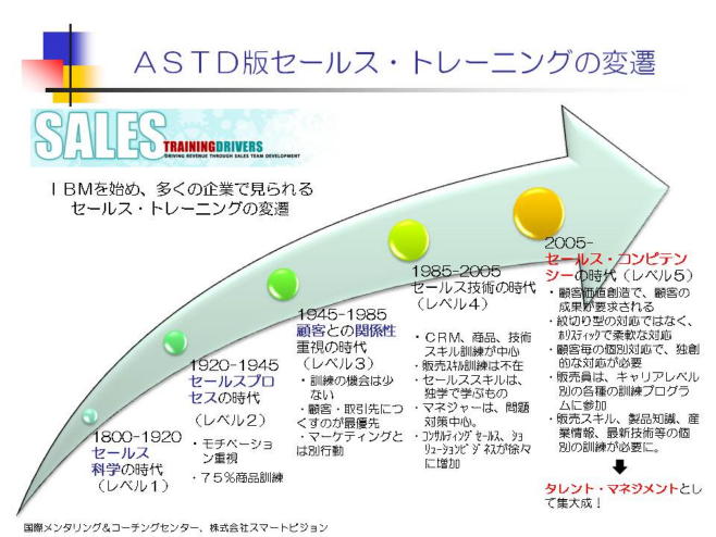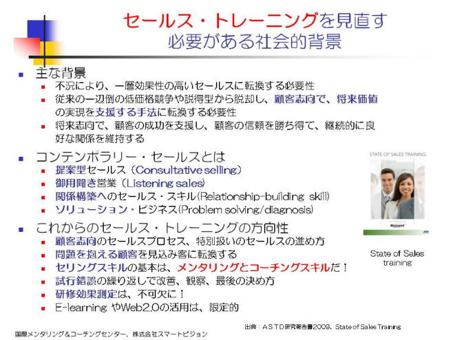 成果主義の強い企業では、売上が一番分かりやすいとの理由で、売上至上主義に陥りがちでした。これが進むと説得商法、押し込み商法、押しかけ商法等々により、顧客満足とは、程遠い状態が慢性化していきます。顧客満足を高めるには、在庫の売り込みや、キャンペーン等の会社側への貢献度より、顧客視点の支援活動を進め、顧客満足度を知る仕組みをつくることが必須です。このような市場の変化に対応するには、従来の売上至上主義、説得型のセールスの手法や方向性を見直す必要があり、ASTD内でもセールス・トレーニングのあるべき姿を求めて、セールス開発&パフォーマンス委員会が2008年に発足し、2009年には、セールストレーニングの調査報告書が発表されました。その中では、提案型、御用聞き営業、ソリューションビジネスを重視したコンテポラリーセールスが基調になり、お客様起点の発想で、説得力ではなく、傾聴力と支援力が求められ、メンタリングやコーチングが重要なスキルであることが強調されています。