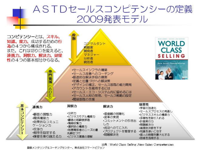 売上至上主義から、顧客起点の考え方に転換し、顧客満足度を高めるためには、従来のセールス手法を変える必要があり、この実現に効果的な活動をASTD版セールス・コンピテンシーとして集大成し、ワールド・クラス・セリング、新セールス・コンピンテンシーとして発表しました。この集大成は、ASTDのセールス部会の3名が中心になり、約2000名に及ぶ協力者から入手した多くのデータを分析し、セールス・コンピンテンシーとして集大成したものです。セールスに重要な連携力、洞察力、解決力、効果性の4項目を基本コンピテンシーとし、13項目の専門領域として定義しました。これらを総合的に判断するこで、顧客満足度の高い、戦略的なセールスの実現を目指しています。 営業部門では、このセールス・コンピテンシーを参考に、各社のセールス・コンピテンシーを独自に構築し、運用することになりますが、グローバル企業にとっては、このセールス・コンピテンシーを念頭に入れ、地域化することで、一層スムースな体系の実現が可能になります。 今や営業部門のセールス・コンピテンシーの導入のため、人事総務が支援する必要性が高っているのです。 タレント・マネジメント・コースでは、セールス・コンピテンシーの概要を紹介していますので、参加をお待ちしております。詳細は、こちら。 ![]() |