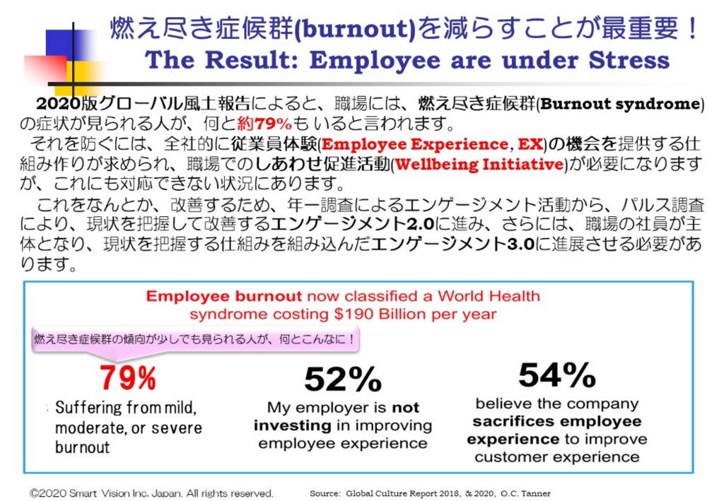 2020年版グローバル風土レポートによると、多くの職場では、仕事を消化するのが、大変な情況にあり、新しい体験をする機会もない、将来の準備のためスキルを磨いている時間も意欲も残ってない、燃え尽き症候群(Burnout syndrome)の症状が見られる人が何と79%もいると言われます。