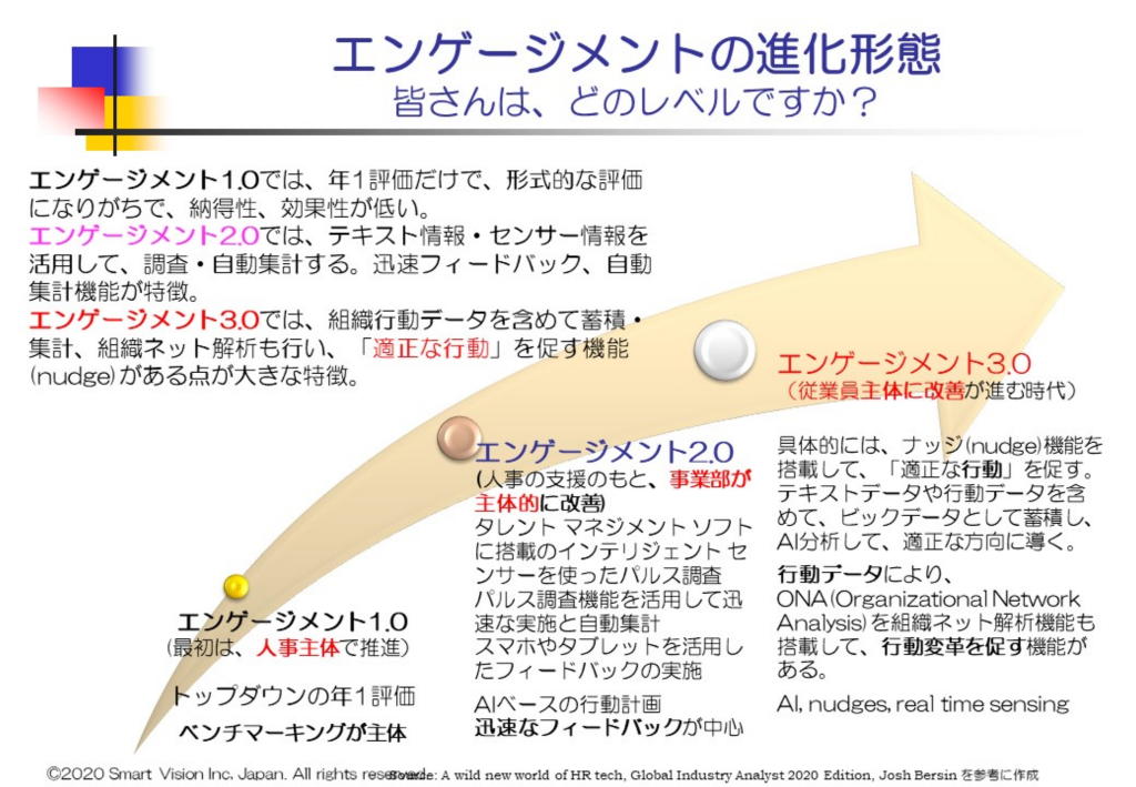多くの先進IT企業では、職場でのエンゲージメント状況や満足度を把握するために、毎月、パルス調査を行う仕組みづくりをするエンゲージメント2.0にして、更に進んだエンゲージメント3.0に進展することになります。