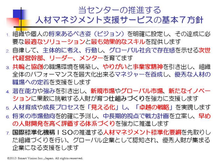 当面は、米国標準化院ANSIのHRM標準化を進めており、2013年中には、ANSI HRMガイドラインをベースに、ISO HR標準として、確立する動きが着々として進んでいる。このグローバルな動きにいち早く対応し、数多くのISO認証をもつ日本企業が、新規のISO HRM認証や更新が可能になるための支援活動を開始している。 この方針に基づき、下記に示す「7つの基本方針」を明確にした。 |
