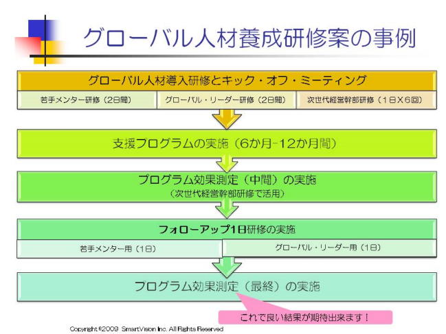 優秀な教育を受けた現地の人材は、そのほとんどが、欧米的な論理思考の考え方、仕事の手法を原則的に身につけていますので、その手法をキチンと理解し、把握した上で、日本的な良さを織り込む配慮が必要です。彼らの考え方、進め方を理解しようとせず、日本式の手法だけを押し付けると、大きな抵抗を呼ぶことになります。 次世代経営幹部には、グローバル・ビジネスに率先して取り組んで頂くため、グローバル企業で普及が進むタレント・マネジメントの手法とその応用事例を実践的に学びます。また、地域拡大戦略を実現を可能にする育成風土を高めるため、20-30歳代の若手社員には、基本的な指導・支援法を学ぶ機会をつくり、若手メンターとして活躍して頂きます。また、多くの中堅リーダーを早めに現地でのマネジャーとして、活躍してもらう機会をつくるため、グローバル人材養成研修を実施することも必要になります。従来のピラミッド組織をプロジェクト制に転換、単純にフラット組織にしても、直ぐに高業績を達成することにはなりません。従来のプロジェクト別の職制では、組織の垣根が厳然として存在し、これを乗り越えることは、非常に難しいのが現実です。 詳細は、無料見積をご利用下さい。 |