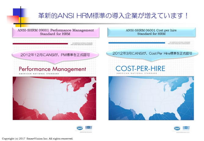 米国人材マネジメント協会SHRMでは、人材マネジメントHRMの標準化に乗り出し、米国国家規格協会ANSIの事務局として、2009年から準備を開始しました。ANSIは、国際標準化機構ISOにHRM標準の提言を行い、2011年1月には、TC260として、準備委員会が発足した。