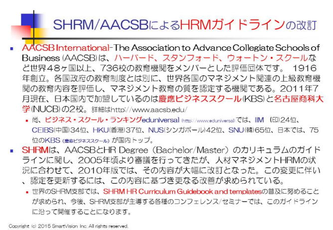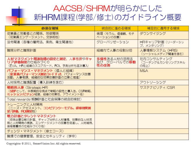また、世界最大のHRプロ支援団体人材マネジメント協会SHRM(会員30万人)が、2005年より、HR Degreeのカリキュラムの改訂に関して、AACSBと話し合いを続けた結果、2010年版より、従来の内容が大きく改訂され、多くの最新のHRM課目が追加になった。 これを新HRM体系をSHRM/AACSB版 HRMガイドブックとして発表した。