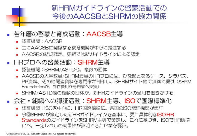 今回の新HRMラインガイドは、従来各団体にて、ばらばらの方針により、別々に推進してきましたが、HRプロ コミュニティとして世界最大のSHRMがAACSBとHRMガイドラインを共通化することで、社会への普及が加速することが期待できる。