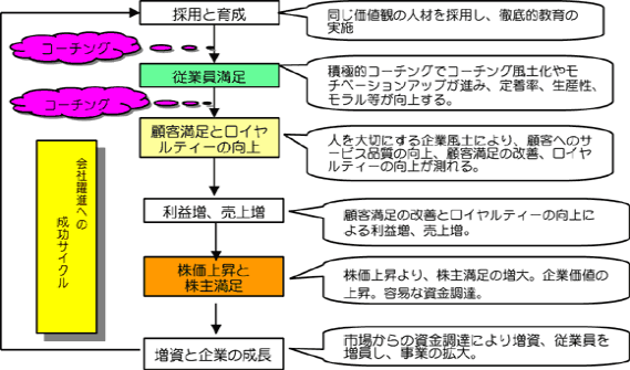 この間、育成された支援型リーダー(メンター)が中心となり, 将来的には、関連企業も含めた得意先企業の核となる技師への技術を進め、支援範囲を広げます。これで、顧客満足、顧客ロイヤルティが向上し、売上増、利益増を図り、会社躍進への成功サイクルが構築されます。 |