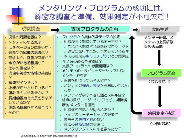 4−1 職場で何を改善したいと考えていますか? 色々考えると、どれも必要に感じませんか? 職場環境を改善し、業績を延ばしたいと考えておられる方には、一度、成果を引き出すコーチング&メンタリング研修をお試しください。良い結果を引き出すパフォーマンス・タイプのコーチングですので、安心して進められます。メンバーが例え未経験でも、効果を示すメンタリングを活用しますので、効果が高まります。メンバーの意欲と能力を判断し、効果的対応を取りますので、高い効果が見込めます。職場で良く見られる事例で分かり易く学べますので、職場での実施率が上がります。研修後のフォローアップとして、メンタリング・プログラムや効果測定の実施を支援しますので、原因を把握して、改善を進めることが出来ます。
