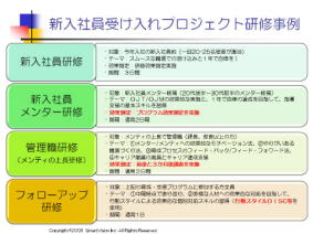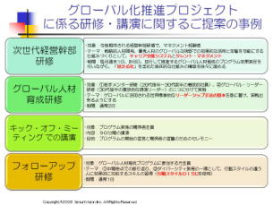 当センターの実施する研修では、効果ありそうだ、職場で是非使ってみたいと思わせる内容がふんだんに含まれており、職場に復帰後、実際に活用したのか、その結果、効果があったのかをアンケートで追跡調査するお手伝いをしております。このような支援することで、職場でキチンと導入されたかを把握し、改善することが出来るようになります。 4−3 目標達成型、ソリューション志向の仮説検証型のプロジェクト支援サービス事例 研修前の打ち合わせをキチンと行うことで、課題を明確にし、そのために必要な前提条件を整えながら、準備を進めるプロジェクト支援を総合的に計画、実施します。6つの事例を参考までにご覧ください。これらのプロジェクト事例は、研修のしっぱなし、担当に全てまかせっきりではなく、チームでフィードバックし、改善する仕組みを如何にしてつくるのかの、具体策のもとに計画的に実施しており、確実な結果に結びつけることが可能になります。