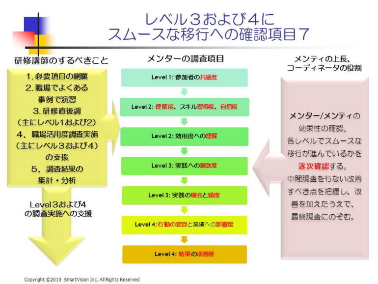 育成の見える化(研修効果測定)のレベル1−5までは、ステップというより、次元が違う切り口で見ますが、各レベルが終わったからと言って、自動的に次のレベルに上がるかどうかは、別問題です。各レベルを通過することは必須条件ですが、十分条件にはなっていないということです。