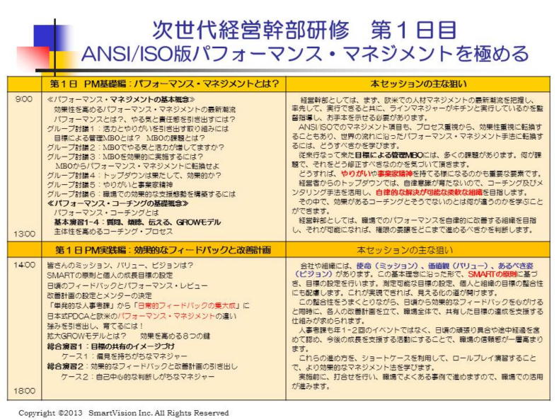 | 一例として、6ヶ月プランを下図に示しましたが、グローバル展開する場合には、ANSI/ISO HR標準化の最新動向等の世界の最新の人財マネジメントの動向を念頭に、これにどう対処すべきかを検討する必要があります。 そのために必要な基礎知識と参考事例を、研修内に提示しますので、これを参考に、各自の目標達成への基本プランを立て、実行部隊となるラインマネジャーと実行チームを編成し、6ヶ月間この教育プログラムを実践し、チーム内での相互の効果測定をして、改善案を引き出します。 尚、11分野での雇用機会均等原則EEOとダイバーシティに関しては、こちらをご覧ください。 下記には、6ヶ月コース案の一部を参考までに、掲載しました。 具体的プランに関して、色々の事例がありますので、無料見積もり相談にて、問い合わせください。 |