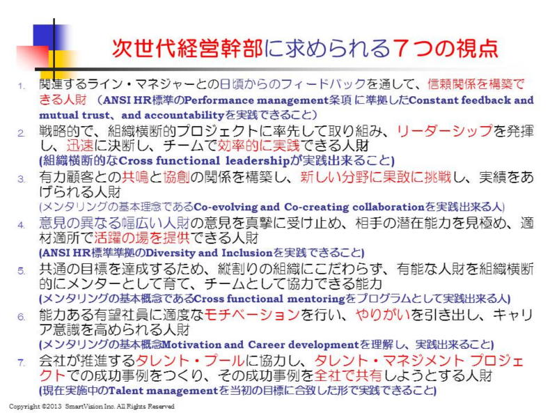 | これからのグローバル・ビジネスにしろ、新規ビジネスの立ちあげにせよ、優秀なタレント人財を惹きつけ、育てられる人財が、次世代経営幹部に求められています。 この実現の核となるのが、タレント・マネジメントの導入と実践ができる人財です。 このプロジェクトの推進には、3−5年先の市場動向を念頭に入れ、それに対応出来るスキルを持つタレント開発が最大の課題になります。将来志向でタレント開発を組織的に実現できるかどうかが成功の鍵となります。 当センターでは、タレント・マネジメントワークショップや早稲田大学オープンカレッジ(社会人向け)での実績を基に、6か月のプログラムとして実行する計画を提案しています。 例えば、次の7つの方向性を示し、これを与えられた6ヶ月の間に、どれだけ実践できるかを実践して頂くものです。 これにより、次世代の経営幹部として何が求められているかを理解し、それをどのように実践できたのか、次世代幹部として、リーダーシップを発揮し、ライン・マネジャーに良い影響を与えたかを効果測定します。 タレント・マネジメントのソフトを導入したが、一向に有効活用が進んでいない場合には、非常に大きな刺激剤になりますので、スムースな導入につながります。 この中で一番問われることは、「如何にタレント開発を進めるべきか?」になります。 タレント開発の進め方に関しては、こちらをご覧ください。 詳細は、無料見積、提案依頼をご利用下さい。 |