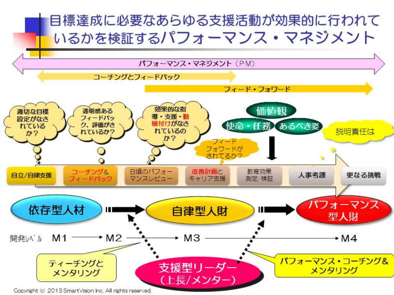 | 2014年から、国際標準化機構ISOで正式に導入されるパフォーマンス・マネジメント。 このパフォーマンス・マネジメントの導入に伴い、従来のマネジャーの役割も、従来の目標による管理(MBO)においても、現場リーダーやマネジャーは、最低限の効果を引き出すことが求められ、このための適切なマネジメントがなされているかが問われます。 1年前に立てた古い目標をいくら達成しても、厳しい競争に負けていては、何もなりません。マネジャーは、自分で実行するより、メンバーが実行しやすい環境づくりを行い、適切なフィードバックを行い、改善策を引き出すことです。 メンバーに対して、一方的に指示命令やプレッシャーではなく、効果的なモチベーションをすることで、やる気や活力を与え、有能なる人材を有効に活用し、育てられたかが求められているのです。 過去の事例をそのままやっても、役には立たないことが多いので、顧客に受入れられたかどうかが、問われることになります。 相手のやる気、能力に応じた個別対応リーダーシップを効果的に発揮し、主体性ある行動を促し、事業家精神を引き出す効果的フィードバックやコーチングできたかどうかです。 慣れない、自信のない人、何を目指すべきかを意識してない人には、その指針を示し、一緒に頑張るメンター人材を活用します。こういった一連の活動を複合的、統合的に行うメンタリング手法も身につけ、最大のアウトプットを引き出すマネジメント手法を学びます。 |