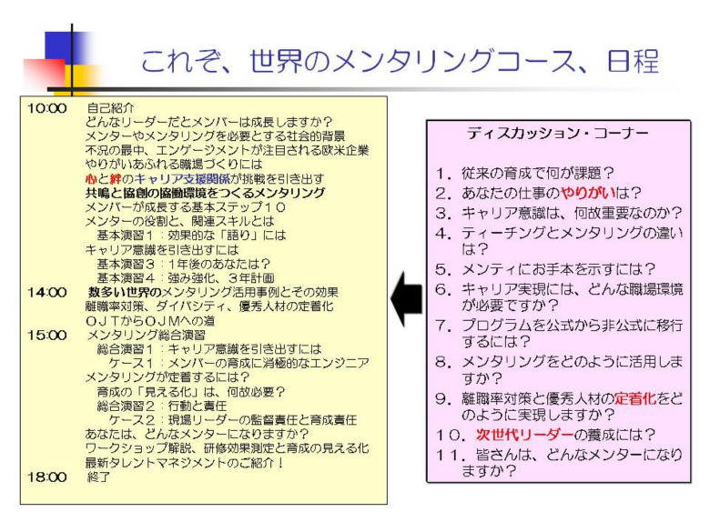 若年者や優秀人材の定着率の向上に貢献する共鳴と協創の仕組みづくりと定着法を「卓越の戦略」の一環としてメンタリングを学ぶことが出来ます。 また、エンゲージメント2.0/3.0の世界をどのように実現するのかのノウハウを学ぶこともできます。 人材育成の素晴らしさを実感し、ポジティブ人材を育てるメンターに必要な実践的なメンタリングを、世界の人材育成・人材開発の7つのプロ集団の国際大会に通算31回参加、9回発表の経験豊かなメンタリングの達人からじかに学ぶことが出来ます。 2011年5月に改訂した新メンタリングバイブルを使用して、事前学習をしますので、理解が深まります。当日、別途お渡しする特製テキストと併せて、最新情報を活用して、皆さんの身近なメンタリング導入事例を考えます。少人数の参加者の参加型ワークショップで進めますので、あっという間に一日が過ぎる価値あるコースです。 尚、4名以上の少人数で申し込み頂きますと、お客様のご都合の良い期日にご要望に応じた内容にて、実施することも可能です。少人数のリーダー研修、メンター研修、マネジャー研修を大変手頃な価格にて、実現できますので、大変魅力的です。