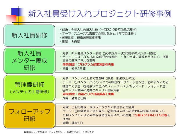 新入社員用の育成支援プログラム終了後に効果測定を実施すると、ほとんどのケースで、約90%以上のメンティは、このプログラムを好意的にとらえており、社会問題にもなっている3年以内に離職率30%以上と言う状況も改善に向かいます。 基礎教育の分しか予算がないので、メンター教育までは、難しいと考える傾向が一部にありますが、、メンター教育は、新入社員だけではなく、将来色々なプロジェクトのスムースな立ち上げにも活用できることや、若手メンターの育成により、先輩と後輩のチームワークや協働環境が改善されるなどの副次的な効用も多く、一度メンターが育てば、新人の育成以外でも、同じ育成スキルが使える様になります。育成意欲の高い職場では、職場の活性化につながり、業績も改善した事例が多々あります。 |
