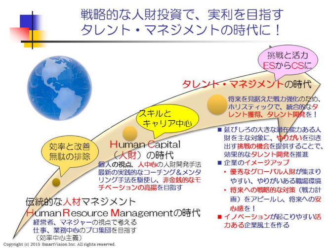 従来、タレント・マネジメントは、一部の潜在能力者だけに実施するものと考えがちでしたが、近年は、この垣根もなくなり、社員全員に適用して、潜在能力の発掘に力をいれる傾向が顕著になっています。 |