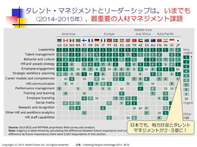 ボストン・コンサルティングが、2年毎に実施するCreating People Advantage調査では、多くの国では、一貫して、「リーダーシップとタレント・マネジメント」を、最重要人材マネジメント施策と報告しています。