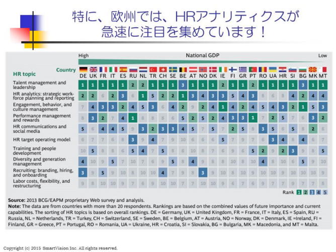 また、欧州企業においても、タレント・マネジメントとリーダーシップが、長年最重要人材マネジメント課題になっており、その次に、HRアナリティクスや戦力計画になります。 |