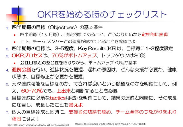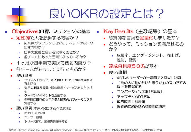 がすでに構築されており、その活用事例が、SHRM2018コンファレンスでも公開されている。 特別の行動センサーを活用する会社(IBM他)等、その種類は、多様化していると言える。 実際の市場では、100種類以上のフィードバック アプリが存在し、その多くは、OKR手法を前提に作られているものが急増したことから、OKR手法の普及は、フィードバック アプリの普及面からも、その普及を推し量ることができる。 尚、OKR手法の実践法に関しては、一般公開コース、パフォーマンス マネジメント実践コース にて、演習を含めて、体験できます。是非、参加ください。 |