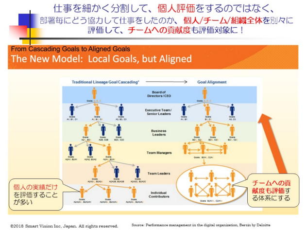 最新版のパフォーマンス マネジメントでは、OKR手法を導入する時、従来の目標管理MBOと大きく異なるのは、チームへの貢献度をきちんと見ることを原則にしている。 尚、従来の目標管理MBOでは、個人評価が中心となりがちで、その結果を給与にも反映しようとして、色々な問題点がでてきたケースが多い。この結果、社員同士の協力関係がなくなり、互いにライバル関係になることもあり、協働関係を保ちにくい傾向があった。