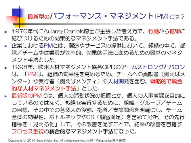 欧州最大の人材開発協会CIPDのバロンとアームストロングは、「単純な目標管理をしたり、個人を評価するのではなく、人材開発を含めて、戦略を効果的に実現するための全体最適で、統合的な人材マネジメント手法の集体系である」としました。従来の監督・指揮スタイルでは、必ずしも優れたパフォーマンスを導くものではないと考えたのです。 また、ギャリー・コーキンスは、「パフォーマンス・マネジメントは、マネジャーとメンバーが連動して、メンバーが事業主であるかのように振舞える職場環境をつくること」だとしました。すべてのメンバーが主体性を持ち、挑戦できる、やりがいあふれる職場を構築するマネジメント手法として普及が進んでいます。 更に、戦略を実行するため、組織/グループ/チームの目標、その中での各個人の役割、指導/支援関係を明確にし、チーム全体の効果性、ボトルネックやCS(顧客満足)を含めて分析、その先行指標を「見える化」して、その改善を促すことで、結果の改善を目指すプロセス重視の統合的なマネジメント手法にしたのです。 従来の統制型のMBO(目標による管理)とは、一線を画しており、従来型のMBOから、最新型のPMスタイルに如何に移行するかが、今後の大きな課題となります。 近年、人材マネジメント(HRM)の中でも、パフォーマンス・マネジメントは、その中核的な存在となり、欧米の有名大学/大学院のHRM課程の中では、パフォーマンス・マネジメントは、必須課目にもなりました。 2011年現在、国際標準化機構ISOで検討中の人材マネジメント(HRM)の標準化でも、その中核的存在として議論されています。 |