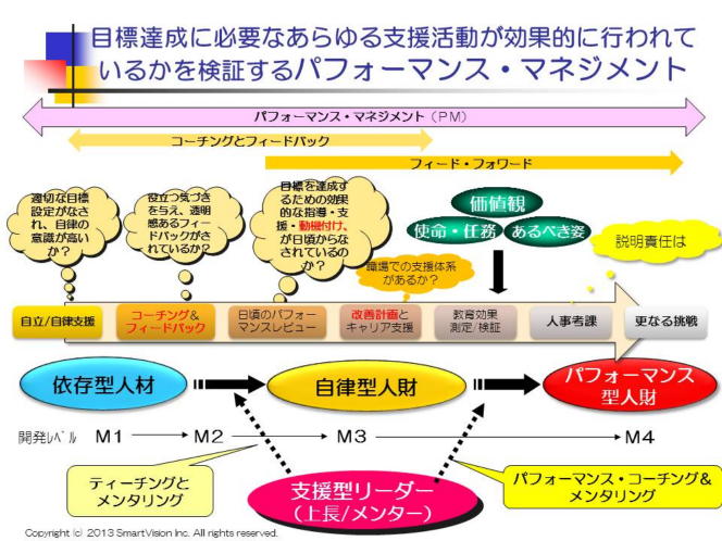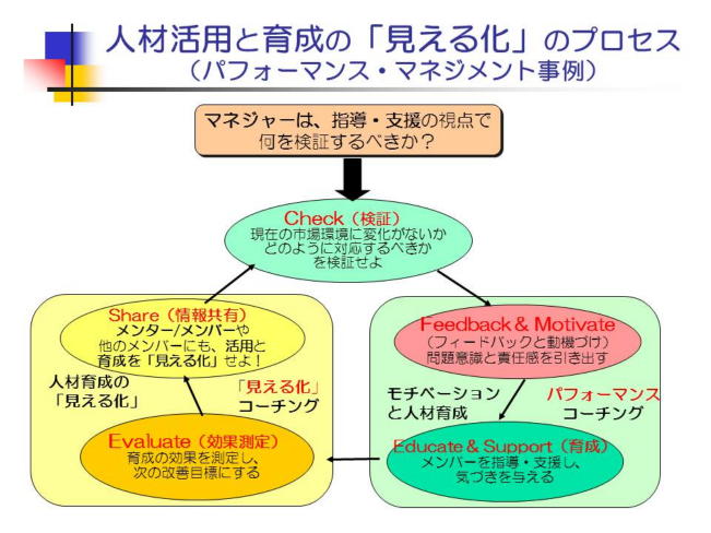 くれぐれも、「おれは自分で勉強して、頑張ったものだ」と言って、まだ慣れないメンバーを放任すると、最終的に期待外れになることが多く、本人の努力不足もさることながら、その多くの責任は、放り出した上長の責任になります。 若手人財の活性化もかねて、やる気のある若手メンターを抜擢して、やる気にしたり、メンバー(メンティ)、メンターへの適切なフィードバックやモチベーションが有効になります。これらの人材育成でのパフォーマンス・マネジメントが、上長及びメンターの今後の大きな課題となります。 これら全体のパフォーマンスをどれだけ改善できるかが、パフォーマンス・マネジメントの神髄なのです。 よくある誤解に、「パフォーマンス・マネジメントは、評価者用なので、自分には関係ないと考える方が結構多い」ですが、決して、評価者用に行われているものではなく、マネジャー/現場リーダー/スーパーバイザー/メンターにとっても、大変重要なベースとなるマネジメント手法と認められており、ANSI/ISO HR標準として、パフォーマンス・マネジメント条項にとりいれられました。 「新版のパフォーマンス・マネジメントを自然に実践できる人財こそが、次世代のマネジャー/リーダー」と思われる様になりました。 詳細は、こちらをご覧下さい。 当センターが主催するワークショップ、企業向け研修では、これらの概念を理解した上で、実践的な学びを沢山得ることができます。 |