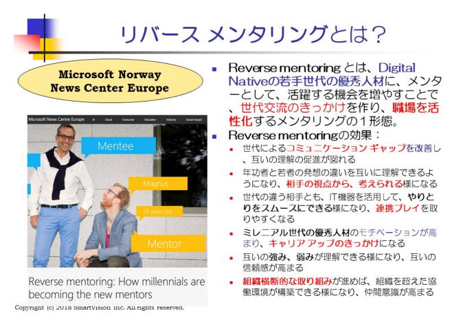 このようなメンタリングの全社的な展開の中で、一番注目を集めているのが、リバース メンタリングです。 |