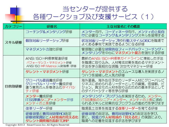 (1)パフォーマンス・コーチング及びメンタリング、個別対応リーダーシップの第1人者としての研修・講座・講演での実績と蓄積があります。
