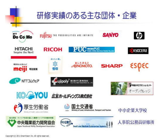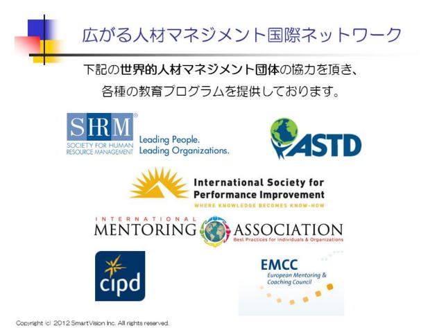 人材育成・人材開発のプロフェッショナルのための7つの国際大会に、通算31回参加し、計9回英語で成果発表、11つの認定プログラムを修了。アジアで一番発表実績のある「人材育成・人材開発、及びメンタリングの達人」として、知られています。全米人材開発協会ASTD(通算10回)及び 国際メンタリング学会(通算5回)、人材マネジメント協会SHRM(通算4回)、国際パフォーマンス改善協会ISPI(通算3回)、欧州メンタリング&コーチング協議会EMCC(1回)等に参加し、日本での導入事例を国際メンタリング学会IMA(通算5回)、国際パフォーマンス改善協会ISPI(通算3回)、成果発表を行った実績があります。欧米での人材育成、人材開発の状況をキチンと把握して、世界の最先端の人材開発の潮流をキチンと把握し、企業研修・ワークショップ・研究会等、日本の同志への情報提供を積極的に行っており、グローバル企業を目指す企業に最適な研修内容になります。