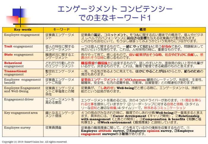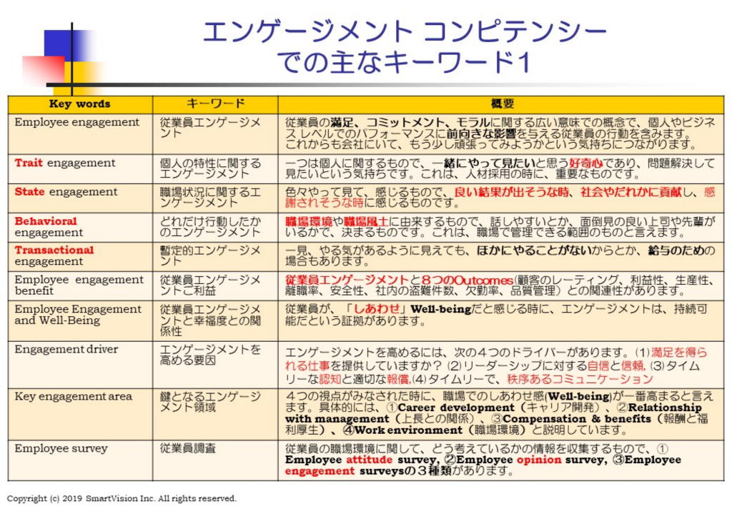 将来志向のSHRMコンピテンシー研究会 試験的にオンライン会議で実施 -------------------------------------------------------------------------- ◆開催日:2020/4/22(水)19:00-21:30 試験的な接続実験と意見交換 ◆テーマ:将来志向のグローバル人材マネジメントを皆で考える研究会 しあわせ感が求められる時代のエンゲージメントとは? エンゲージメントという言葉には、色々な意味が含まれていますが、最近のエンゲージメント では、単純なやる気とか、熱中しているというだけでなく、充実感(fulfillment)があるのかが注 目されています。 この充実感には、 (1)組織への帰属意識が感じられるか、 (2)目標の達成に貢献しているのか、 (3)個人の成長があるのか、 という3つの視点があります。 また、燃え尽き症候群の増加に伴い、単純なエンゲージメントだけでなく、しあわせ感(well -being)も重要だとの意見が強まっています。 この関係性は、こちらに解説しました。 しかも、身体面、メンタル面、資金面、家族関係、社内・地域社会活動の5分野にて、 しあわせ感を感じているかどうかだとも言われます。 また、会社からのお仕着せ的なエンゲージメント改善ではなく、自らが参加・主導する道を 開くことで、新展開が拓けるものです。 上長が、褒めたから、エンゲージメントが改善するという単純なものではありません。 これからのエンゲージメントは、上から目線で、社員のやる気を引き出す活動をすれば良いと の発想から、現場や社員主体のエンゲージメント活動に進化させるには、どうすれば良いの かであり、これをどう進めるべきなのかを、次回のSHRMコンピテンシー研究会で考えます。 過去やってきたやりかたをそのまま実行するのでなく、新しい時代に対応するには、どんな コンピテンシーが必要なのかを考えます。 これからのSHRMコンピテンシー研究会では、過去やってきたやりかたをそのまま実行する のでなく、新しい時代に対応するには、どんなコンピテンシーが必要なのかという視点で考えま すので、楽しみにしてください。 ◆参加費:当面の間は、JSHRM会員・お試し会員共に無料とします。 また、JSHRM会員でない方は、こちらからお試し会員登録して参加ください。 本研究会の申し込みは、こちらから。 |
