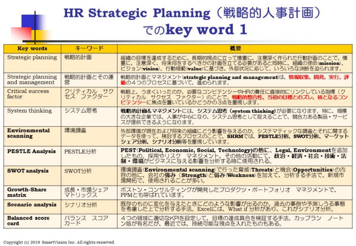 12月からは、今までに学んだ、8つの行動コンピテンシーをベースに、13の具体的な事例に関して、どんなスキルやノウハウがあり、具体的にどう対処すべきかをテクニカル コンピテンシーとして学びます。 初回は、戦略的人事計画、つまり、戦略人事です。 戦略人事には、いろいろなものがありますが、一番大きな課題は、成長戦略であり、グローバル戦略です。 10月26日のJSHRMコンファレンスの基調講演されたメルカリの成長戦略は、典型的な事例でもあります。 また、健康経営、Delivering Happiness戦略もあります。 植物に例えて、枝とり戦略もあります。 植木の手入れを適時してないと、枝葉がぼうぼうに生えて、突然強力な台風がやってくると、ばったりと木が倒れてしまいます。 私の家でも、同様のことを体験し、日頃の手入れが如何に大切なのかを実感しました。 重要なことは、何か課題が見えてきたら、すぐに何をするべきか、その注目すべき視点をどんな手法で見つけ、それにどう対応するべきかをイメージできるテクニカル コンピテンシーを学ぶことです。 まず、基本となるPESTLE分析、SWOT分析、成長・市場シェアマトリックス、シナリオ分析、目標設定に必要なSMARTERの原則、プロジェクト マネジメント手法、枝とり作戦等、いろいろな手法を振り返り、