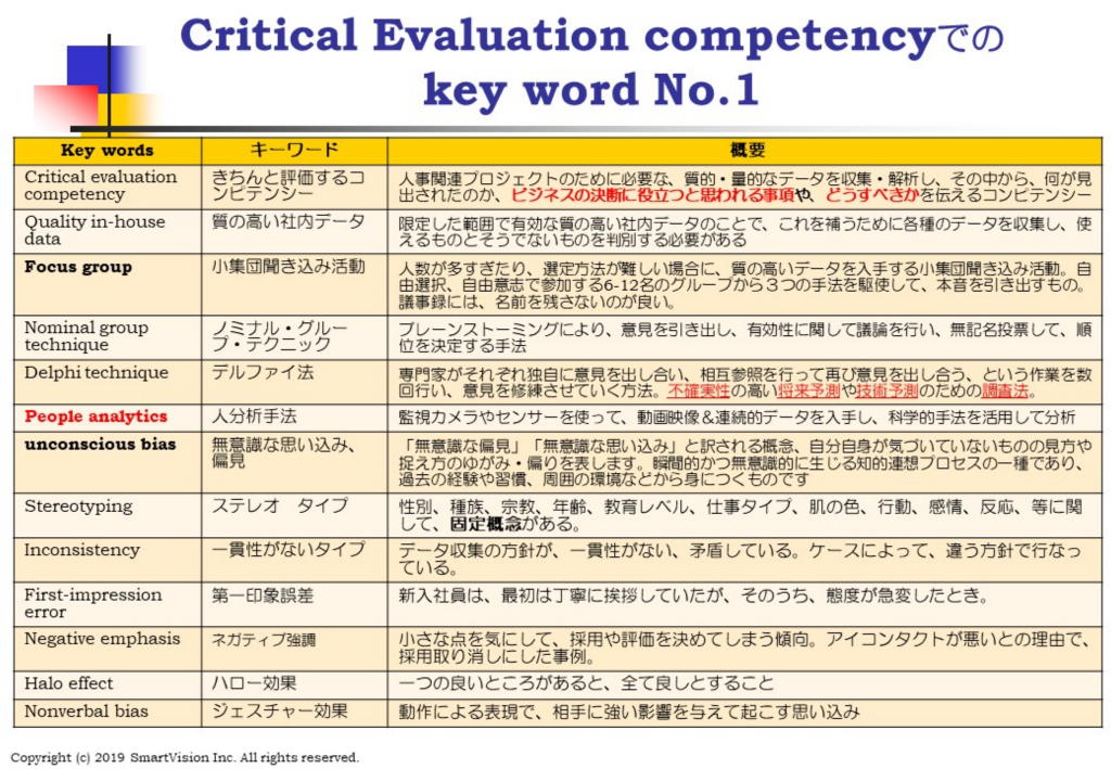 11月は、JSHRM 月例会として、平河町の日本生産性本部にて、11月25日(月)に開催します。 ◆開催日:11月開催:2019/11/25(月) 19:00-21:30 ◆テーマ:グローバル人材マネジメントのグローバル標準になった、 11月テーマ:クリティカル評価コンピテンシー キチンと評価し、どうすべきかを的確に伝えるコンピテンシー