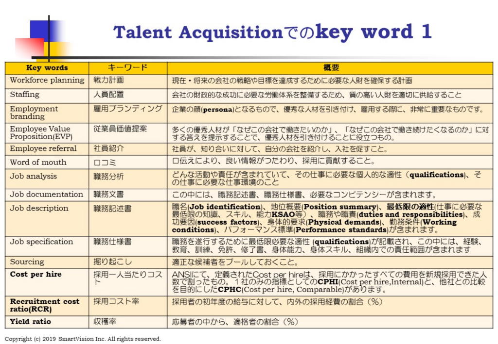 それとも、自分のやりたい事が出来るかどうか、あるいは、自分の希望するキャリアを実現できるのか、どうかですか? 若い優秀なグローバル人材が期待しているのは、有名企業に就職できるとか、高い給与を得られるのかより、むしろ、自分が目指しているEmployee Experience(EX)が体験できるのかにかかっていると言えます。 それでは、これが実現できるかどうかをわかりやすく、楽しく、映像にて、伝えられるかであり、そのために、多機能化したスマホやSNS等の最新技術が大変役に立ちます。 1月のSHRMコンピテンシーでは、優良企業では、グローバル人財を採用するため、どんな採用活動を行い、どんな視点で、選抜しているのかを基本に戻り、考えてみたいと考えています。 国内の採用と違い、グローバル採用では、色々な手法がありますが、その中でどの手法が適しているのかを考えられるようになるためにSHRHコンピテンシーを学ぶことになります。