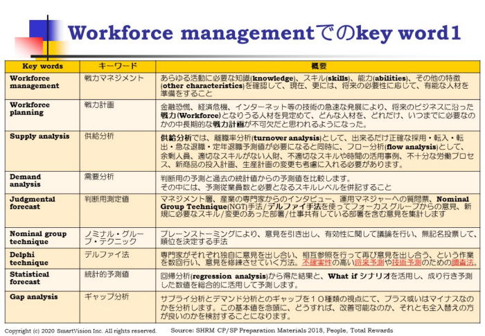 次回は、9月23日(水)に、SHRMコンピテンシー研究会を開催します。 9月は、「戦力マネジメント コンピテンシー(Workforce management Competency)」 が、テーマになります。 Workforceというと、人員と訳す人が多いですが、ここでは、「働く力の強化」を目指すこ とで、敢えて、戦力とします。 その中には、タレント マネジメント、最新のパフォーマンス マネジメント、更には、