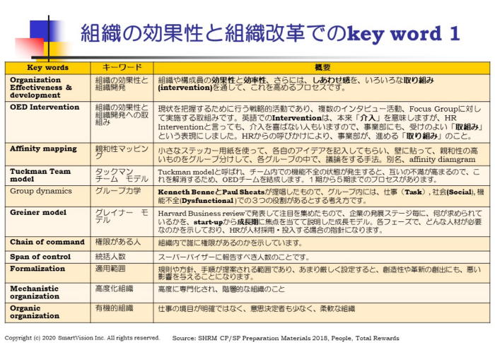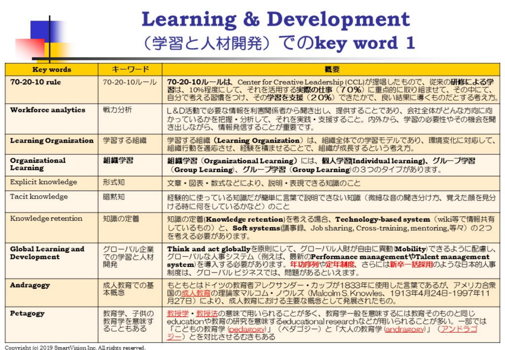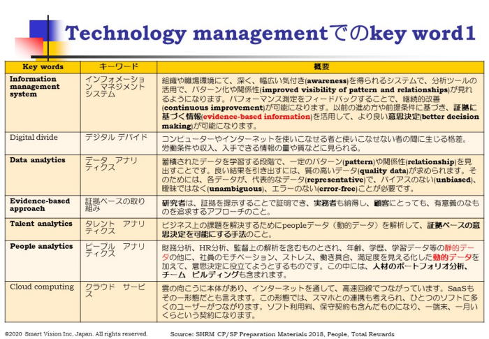 次回は、10月21日(水)に「技術 マネジメント コンピテンシー(Technology management Competency)」をテーマに開催します。 Technologyというと、HRテックと思う方が多いですが、SHRMでは、いわゆるHRテック を意味している訳ではありません。あくまでも、SHRMの基本テキストに沿った内容であり、 HRIS等のInformation management,SaaS,cloud computing, mobile app等の話に なります。 さらには、Intellectual CapitalとしてのHR Analysis,開放性(Openness) &透明性 (Transparency)、即時性(Real-time),ビジネス プロセス 統合(Business process integration)、電子調達(e-procurement)、電子署名(electronic signatures)、電子記録 (electronic record keeping)にまで広がります。 大手企業では、これらは、情報処理部門の仕事だと思いがちですが、人事でも、これらの基本 知識がないと恥をかくかもしれない、人事のためのやさしい技術の話をさせて頂きます。 本研究会は、グローバル標準の人材マネジメントの考え方(SHRMコンピテンシー)を学ぶ研 究会ですが、SHRMの最新情報だけでなく、Online Josh Bersin Academyで発表されてい る最新情報を含めて、提供します。 使用資料には、最新の情報を含める為、直前に完成しますが、JSHRM会員で、会費をお支払 い頂いた方には、終了後に、pdf資料をお送りします。復習にご活用ください。参加お待ちして おります。 楽天銀行に、会社のネット口座を開設しましたので、楽天銀行、三菱UFJ銀行、みずほ銀行、 ゆうちょ銀行等に口座をお持ちであれば、大変安い費用にて、送金が可能になります。オンライ ンで、楽天銀行口座を開設しますと、振込費用が基本、無料になります。 開催前までに、下記口座に、振込ください。 口座名:株式会社スマートビジョン、代表取締役、石川 洋 口座番号:楽天銀行、第一営業支店、支店番号251, 普通預金、7990003